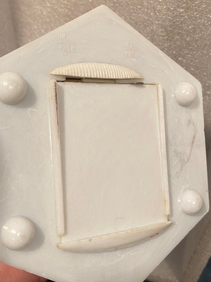 The water globe works but is a little foggy on the outside. It has a stopper on the bottom of the globe that you can see after you twist off the top. The base is black and the inside scene is Jesus in the manger in the stable being visited by 2 angels on both sides.