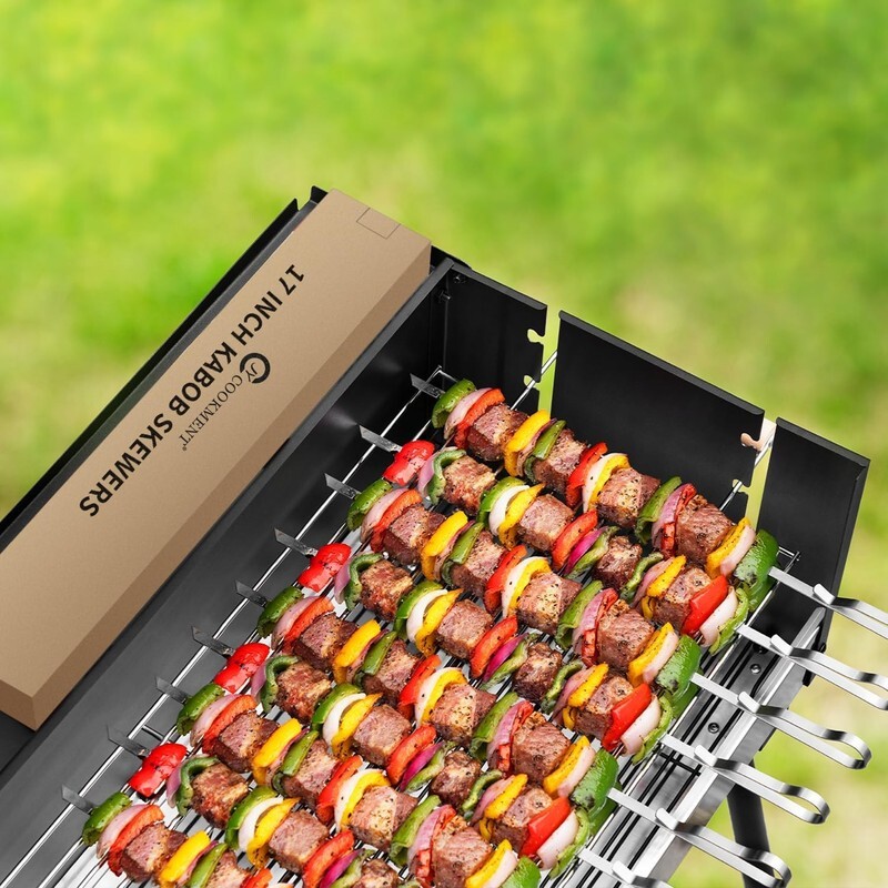 ?Perfectly Longer Length of 17 inch, ERGONOMIC HANDLE?These 17-inch skewers are the perfect length to fit most grills and are long enough to hold a significant quantity of meat and vegetables. Long barbecue skewers keep your hands away from heat source. The wavy handle makes handling easier. These shish kabob skewers are long enough to protect your hands from the grill heat. It also allows you to flip them easily without taking off the grill lid saving you time and energy.