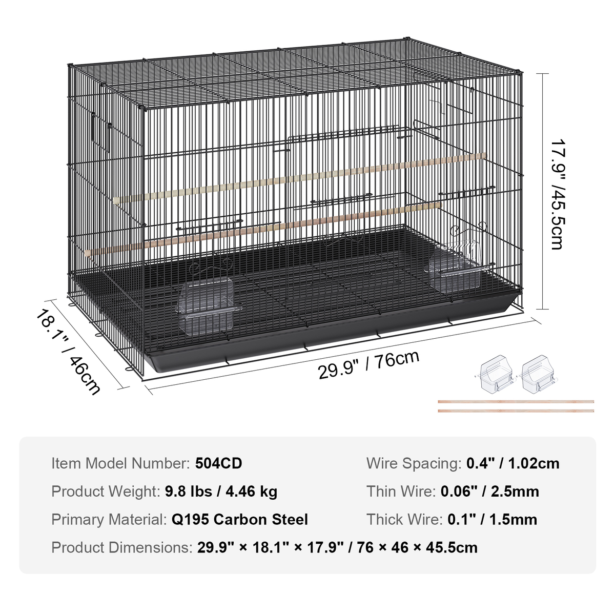 Ample Space: Measuring 29.9"L x 18.1"W x 17.9"H, with a 0.4'' grid spacing, this bird flight cage offers a roomy, comfortable living space for your pet birds to move freely, rest, and stretch their wings. Allow them to enjoy free and comfortable movement within a limited area.