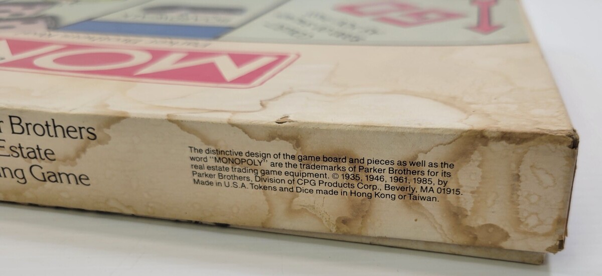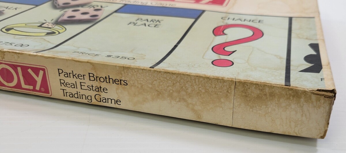 Game is in vintage condition with significant signs of age, use and years of attic storage. The box as well as all cardboard and paper contents have some sort of staining, fading or discoloration due to age and storage. All pieces are included EXCEPT for the dice. which were lost.