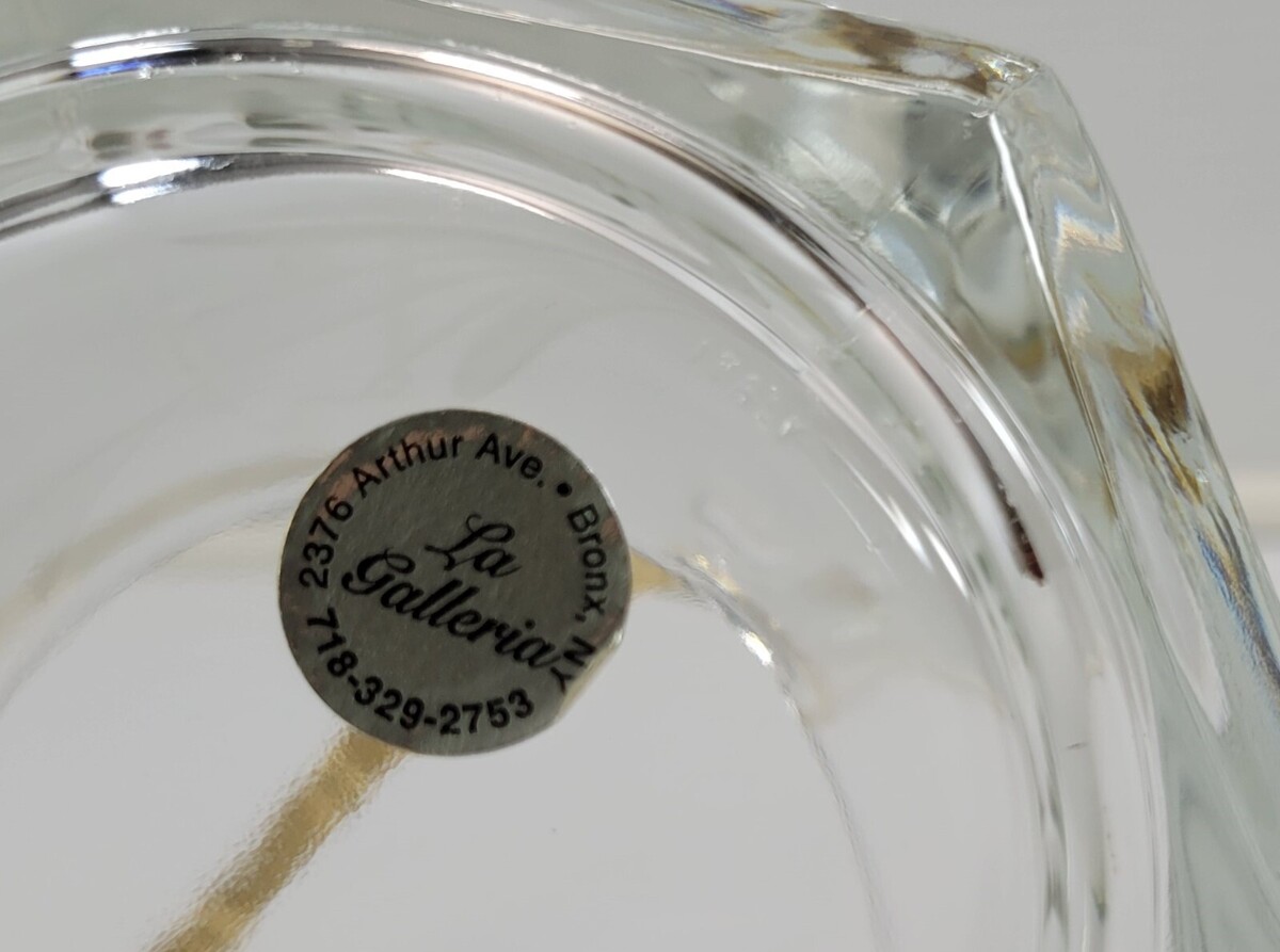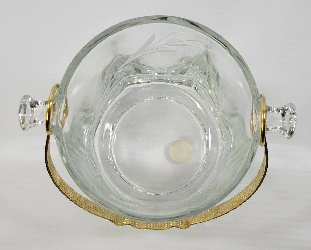 MM) Vintage Etched Flower Wheat Stem Clear Glass Ice Bowl Gold Tone Tongs Italy