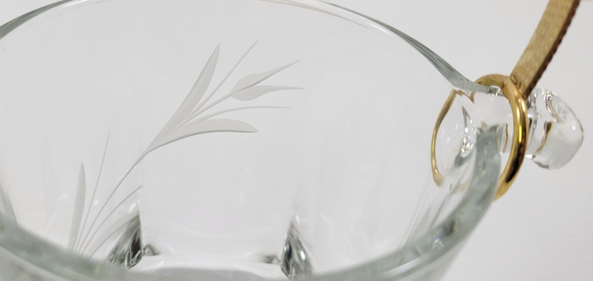Vintage Etched Flower Wheat Stem Clear Glass Ice Bowl with Gold Tone Tongs