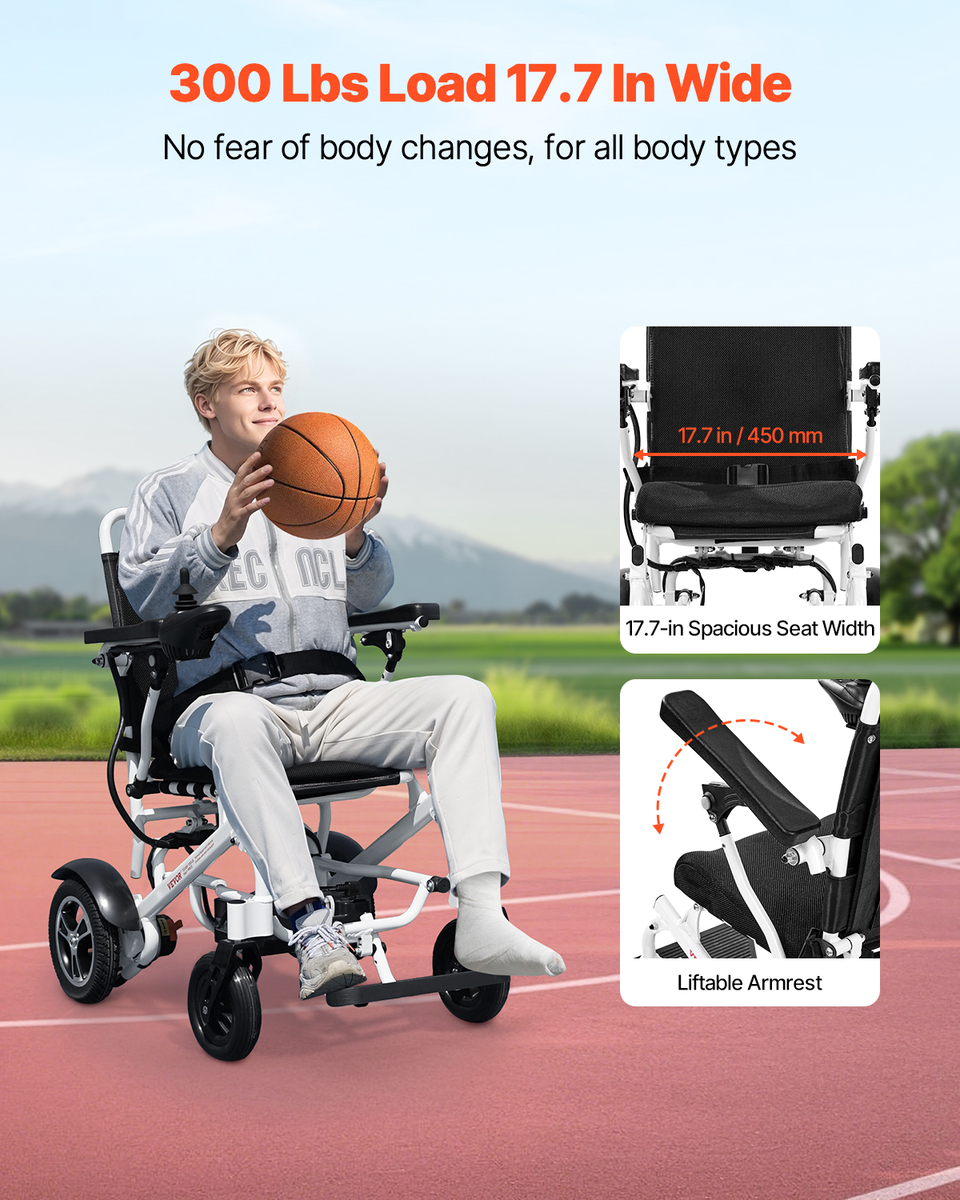 300lbs Weight Capacity: Supports up to 300lbs (136kg) with a spacious 17.5-inch (45cm) seat for comfort and stability. The sturdy metal frame ensures long-lasting durability, making this electric wheel chair ideal for everyday use