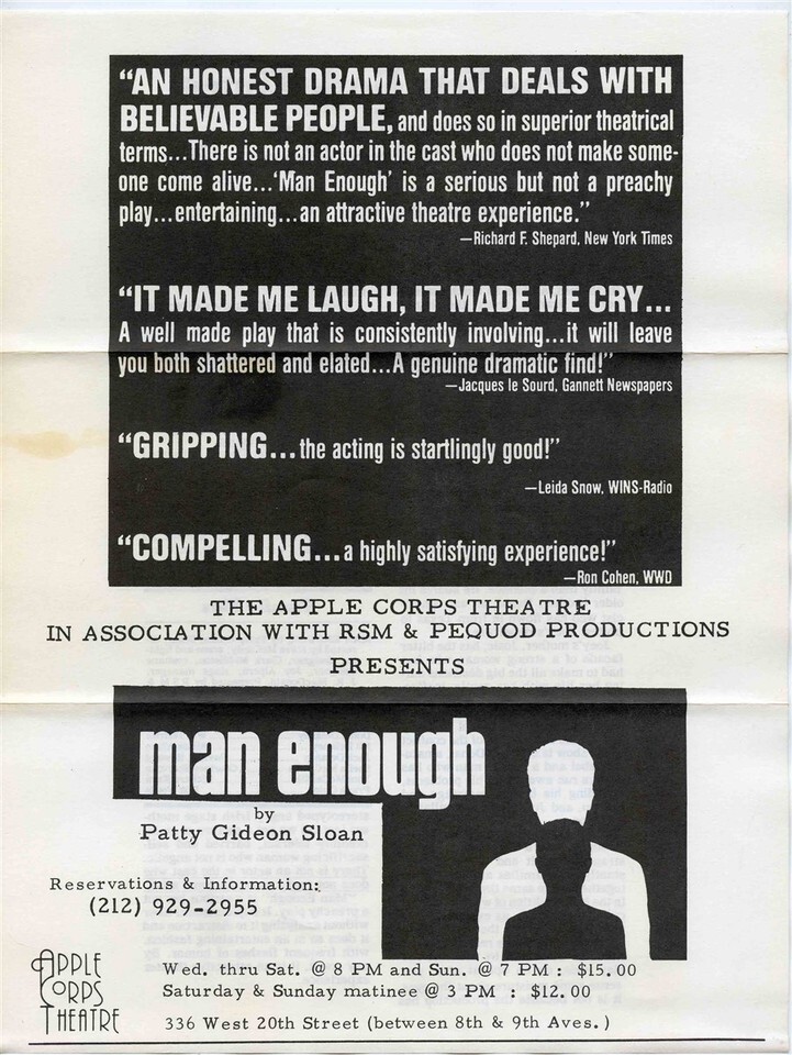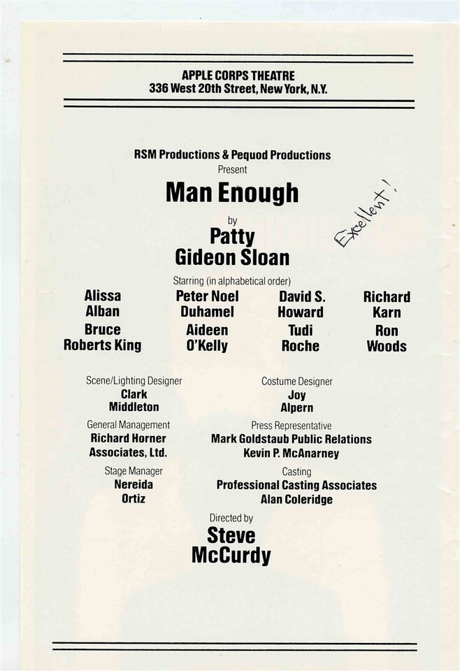 A program and flyer from the Off Broadway production of Man Enough at the Apple Corps Theatre New York. From 1985 , starring Richard Karn
