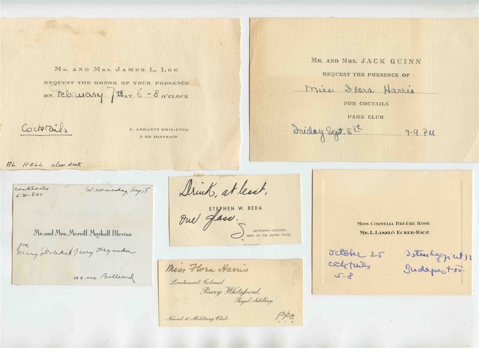 10 different invitations sent to a female member of the American Embassy in Budapest Hungary in 1945 and 1946 . For Cocktails, Dinner, Soiree and more. One given by a Lt Colonel, Larger ones measures about 4" x 6" and others are smaller. 10 different Cocktail Party Concerts Invitations Budapest Hungary 1945 1946