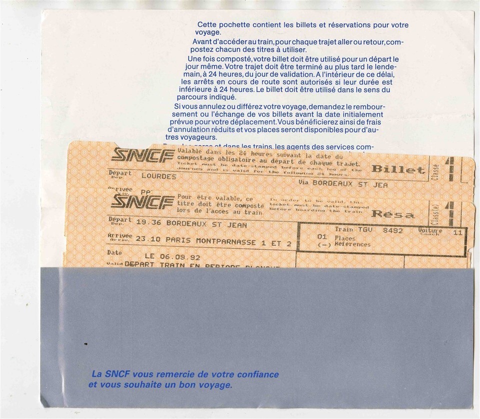 A SNCF French National Railroads Ticket Jacket containing 2 Tickets dated 1992. One from Bordeaux to Paris and the other from Lourdes to Paris.