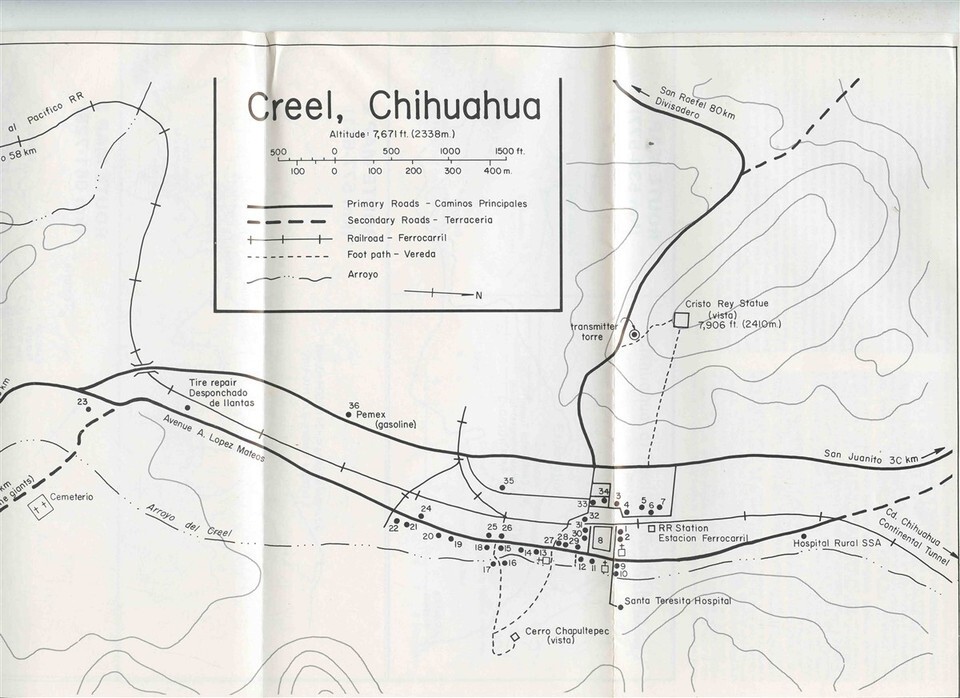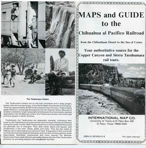 A 20 panel fold out in English. With many maps and detailed guide. Maps Guide to Chihuahau al Pacifico Railroad. From the Chihauhua Desert to the Sea of Cortez . With Route information, Altitude Profile Map and 4 stripe Route Maps. Plus map and information on Creel Chihuahua. And history.