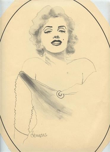 A large irregular oval measuring about 10 1/2" x 15" on heavy paper. Marilyn Monroe Original Drawing by Clemons . From 1975