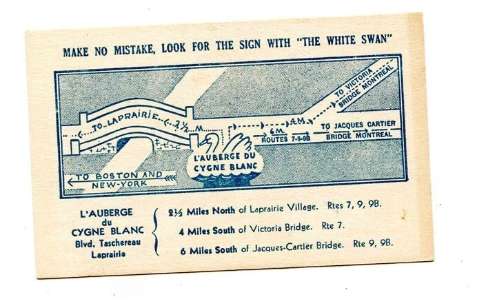 A 2 sided L' Auberge du Cygne Blanc Hotel Business Card. Located in Montreal Quebec Canada. Has map with location on the back. In English, circa 1950's