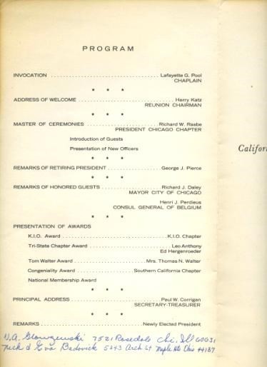 A dinner menu and program from the Silver Anniversary Reunion of the 3d Armored Division at the Sherman Hotel in Chicago, Illinois on July 22, 1972. in good condition with creases and wear. Measures about 7" x 12 1/2" when closed.