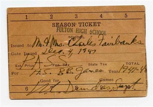 A single sided card that measures about 3 7/8" x 2 1/2" and the back is blank. A Fulton High School Season Ticket for the 1947- 1948 Season. Good for High School Basketball Games and was issued to Mr and Mrs Charles Fairbanks