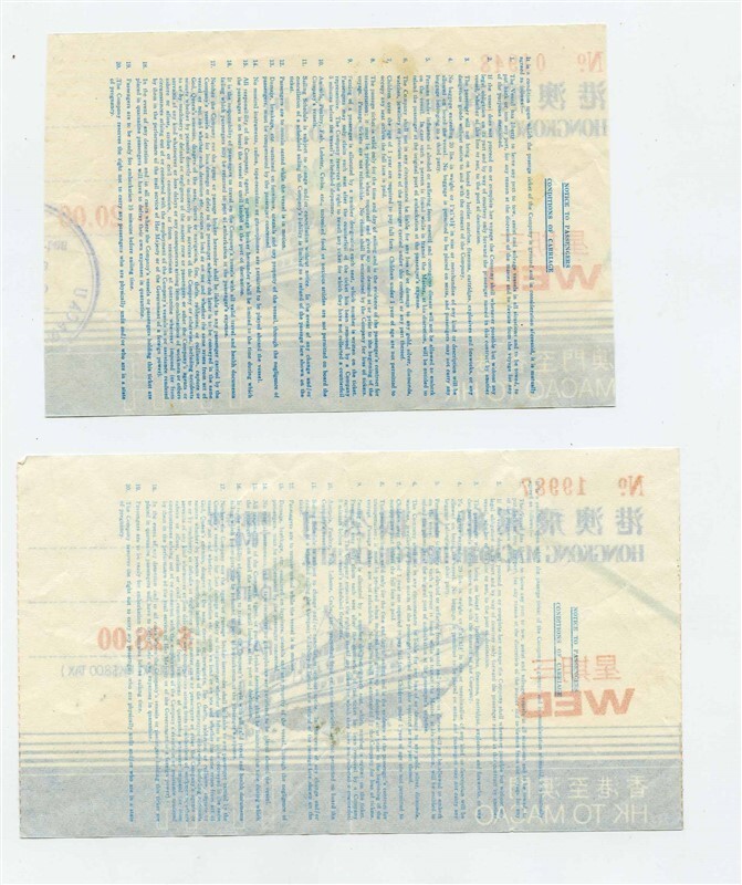 A pair of tickets from Hong Kong to Macau and from Macau to Hong Kong. These Hydrofoil Ferry Tickets are from 1978. On the Hong Kong Macau HydroFoil Co Ltd. To Macao was $28 and the return ticket was $20. One ticket apears to have been trimmed.