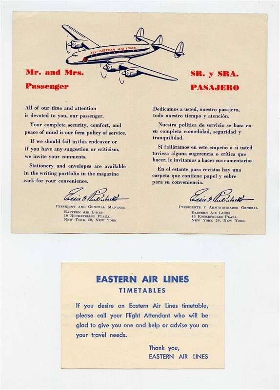 There are 4 items in this lot. An unused Eastern Airlines Silver Falcon Postcard. A Western Union Telegraph Co Send a Telegram while Enroute card, An If You Wish Send Your Comment brochure in English and Spanish, and a request for a Time Table instruction card.