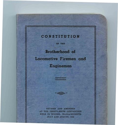 A 300+ page 4 1/4" x 5 7/8" card cover booklet. Constitution of the Brotherhood of Locomotive Firemen and Enginemen . As revised at the Thirty Sixth Convention, Boston Massachusetts, July and August. 1953