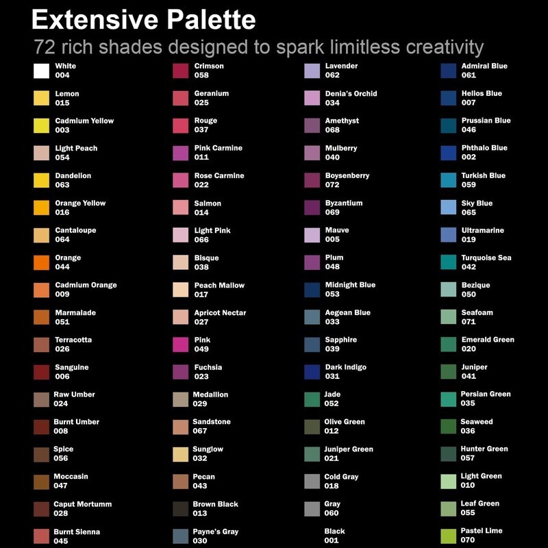 === Ergonomically designed barrels, each distinctly named and numbered, and marked to indicate lightfastness