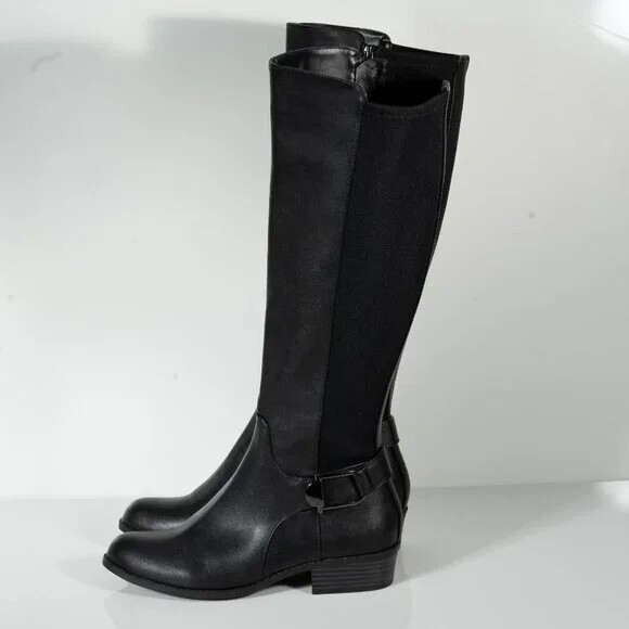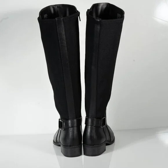 The ALFANI Women's Black Arch Support Kallumm Round Toe Block Heel Riding Boot in size 6 Medium offers a stylish and comfortable option for casual occasions. This knee-high boot features a round toe, zip closure, and a low block heel for added support. The faux leather upper, fabric lining, and polyurethane outsole provide durability and a touch of luxury. Perfect for the winter, fall, and spring seasons, this riding boot from Alfani is a versatile addition to any woman's wardrobe.