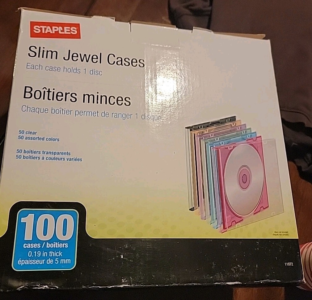 The product is a lot of 100 new Staples slim jewel CD cases in assorted colors. These cases are designed in a slimline jewel case packaging style, making them compact and easy to store. The multicolor cases are from China and are ideal for organizing and storing CDs or DVDs. The Staples brand ensures quality and durability in this product.