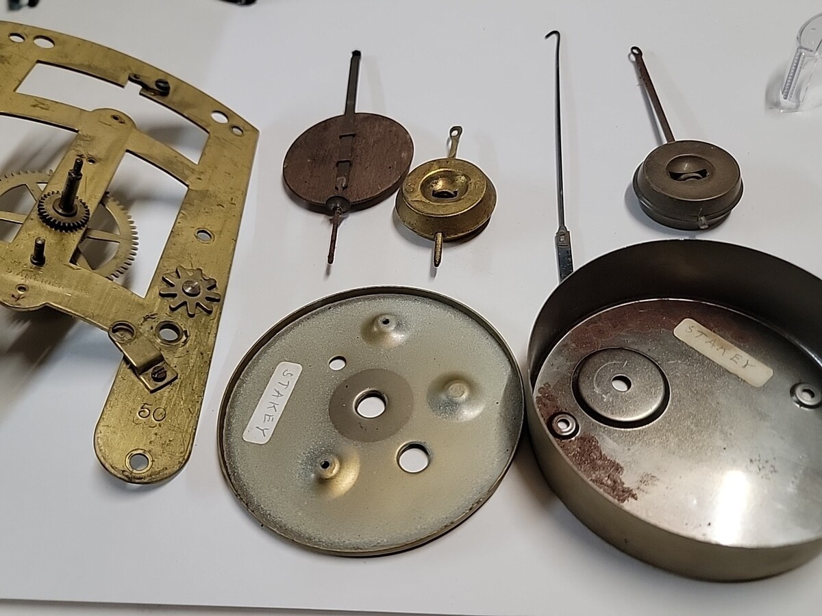 The product is a lot of used old clock parts from unknown brand. These clock parts are perfect for collectors or enthusiasts looking to repair or restore vintage clocks. The lot may include various components such as gears, hands, and dials, allowing for the customization and restoration of unique and classic timepieces.