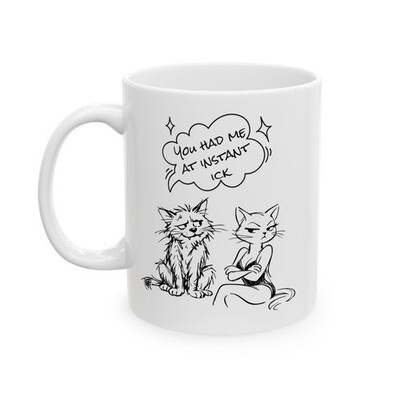 This funny, sarcastic cat mug features the phrase ?You Had Me at Instant Ick,? making it a perfect adult humor ceramic coffee mug for cat lovers and sarcasm fans alike. Crafted from durable ceramic with a glossy finish, it?s ideal for enjoying coffee, tea, or hot cocoa at home or the office. This novelty cat mug also makes a fun and relatable gift for coworkers, friends, or anyone who appreciates snarky humor and cats.