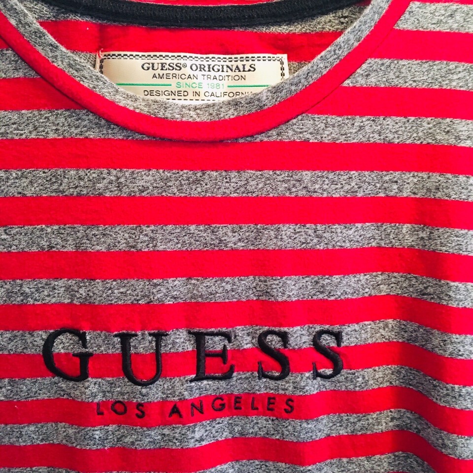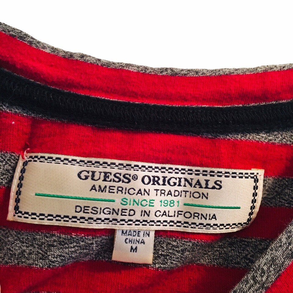 Elevate your casual wardrobe with this vintage Y2K Guess Los Angeles t-shirt. The red and gray striped tee is made from 100% cotton, featuring short sleeves and a chest size of 22 inches. The shirt has a preppy look, perfect for men who love to stay stylish and comfortable at the same time.