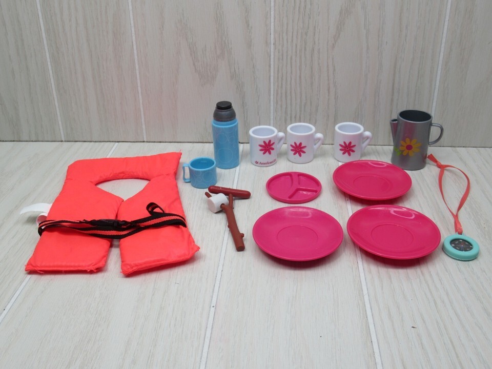 American Girl Cafe pink flower coffee mugs plates Battat camping accessory lot