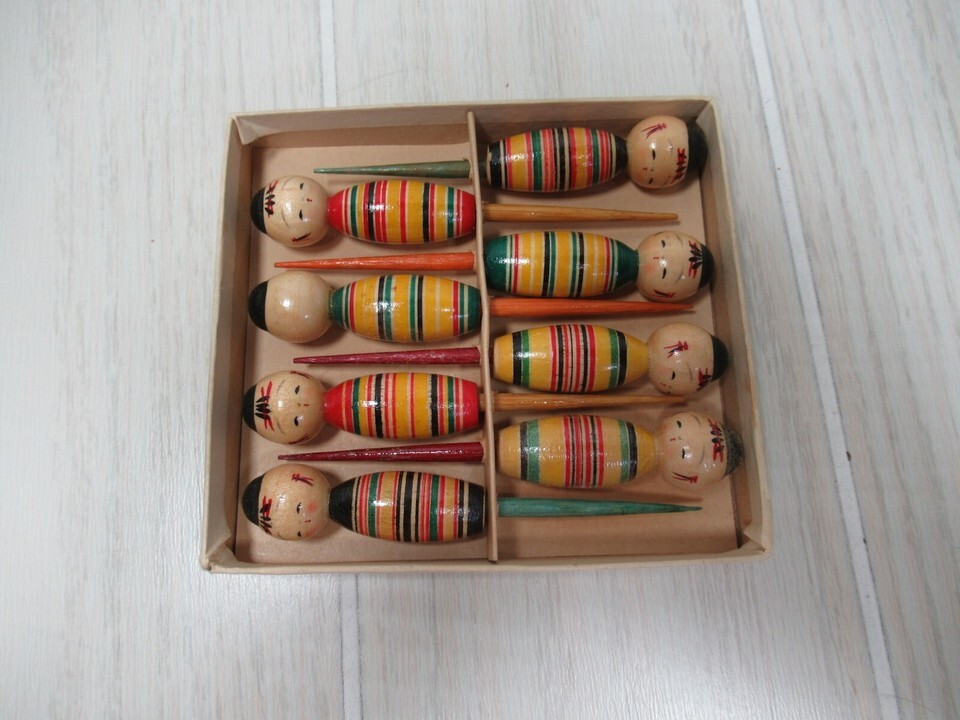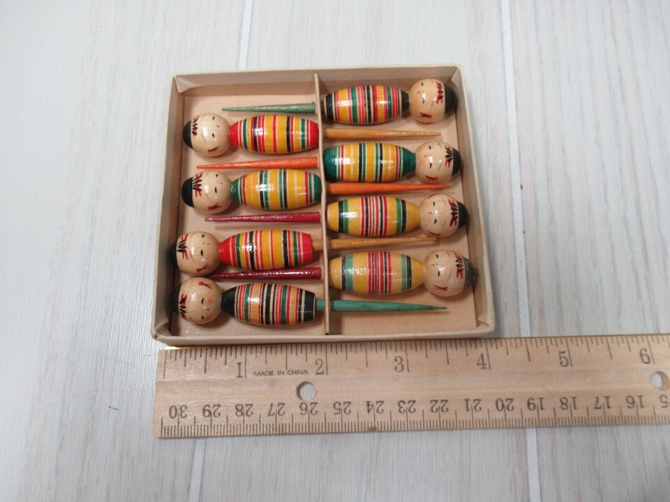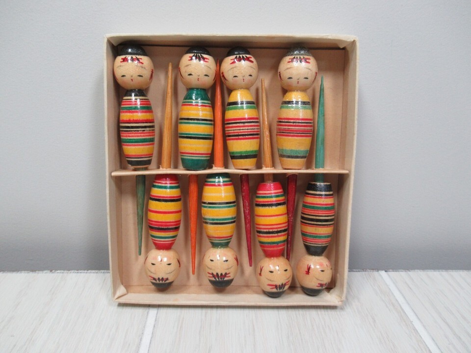 Kokeshi doll set of vintage cocktail drink picks cheese small wooden barware