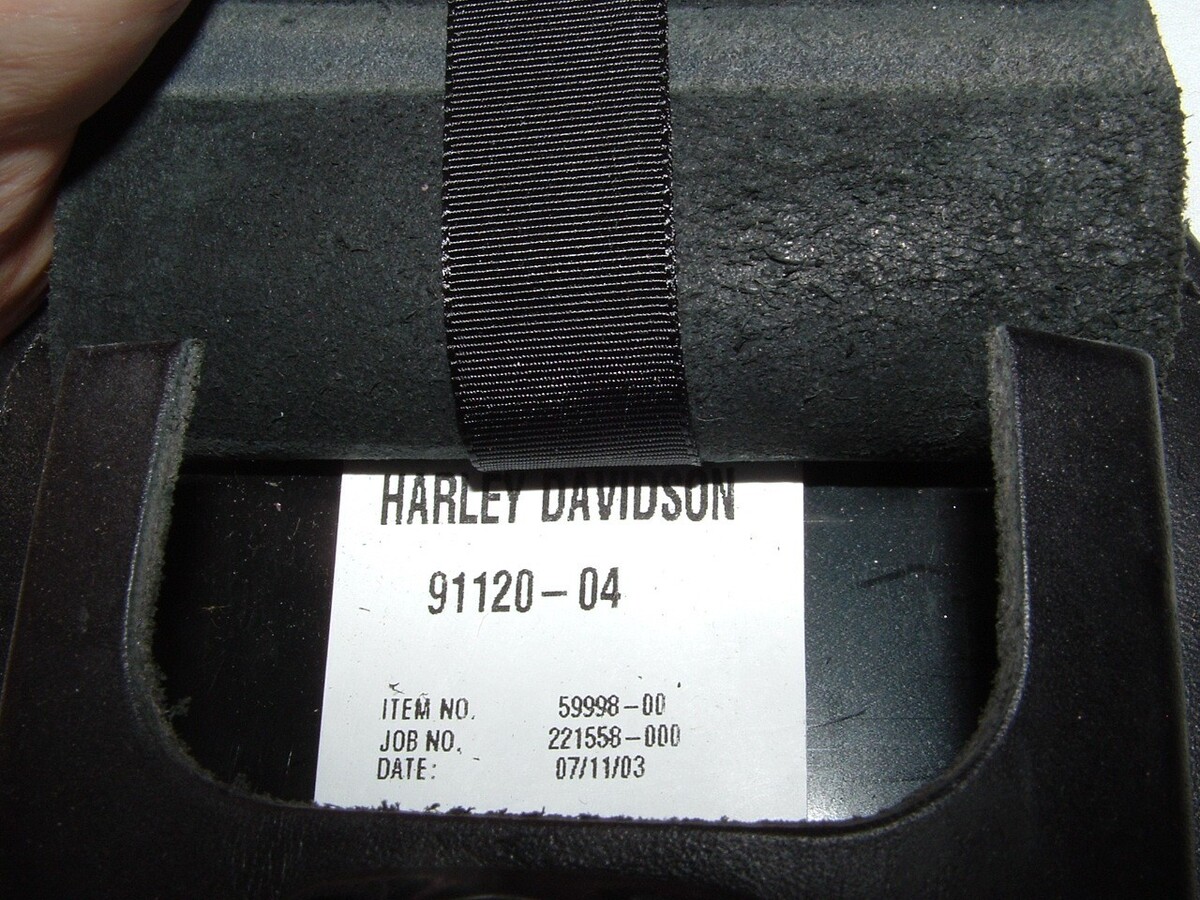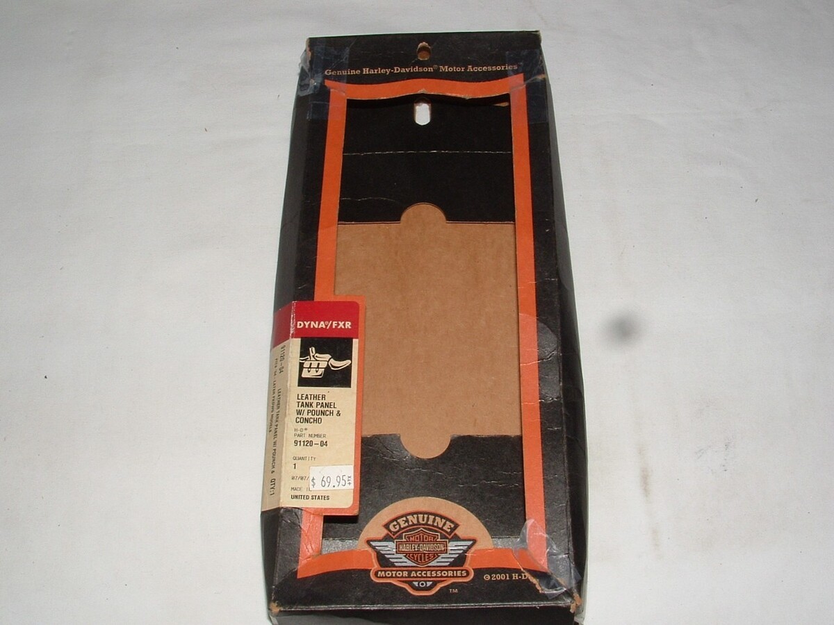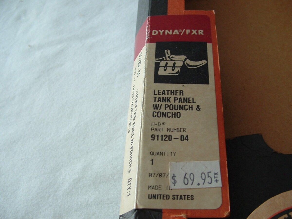 Harley Davidson Leather tank Panel with pouch and concho. Part number 91120-04. Fits 2004 and up FXDWG models. May or may not fit other models/years so check with your dealer on that. How far up in model years this fits I don't know, so again check with your dealer. This is a new part. Has the factory box, but the box is a little rough as shown. The part is perfect. The price tag shown is from 2004. $5.00 shipping to the lower 48.