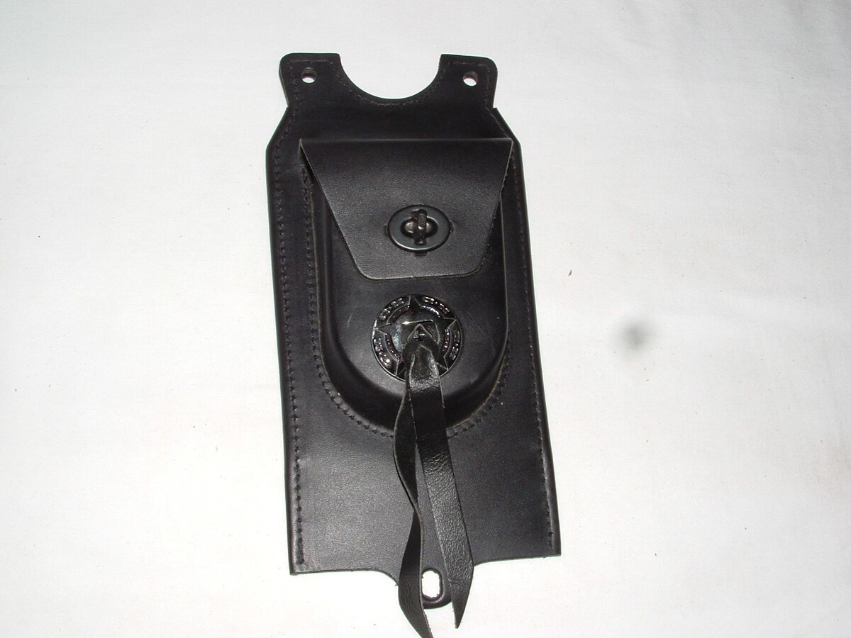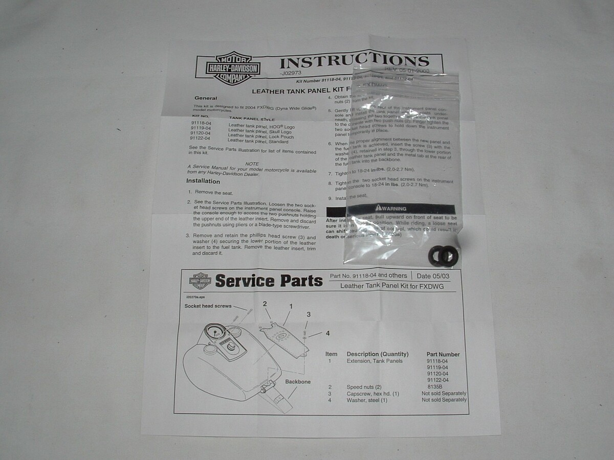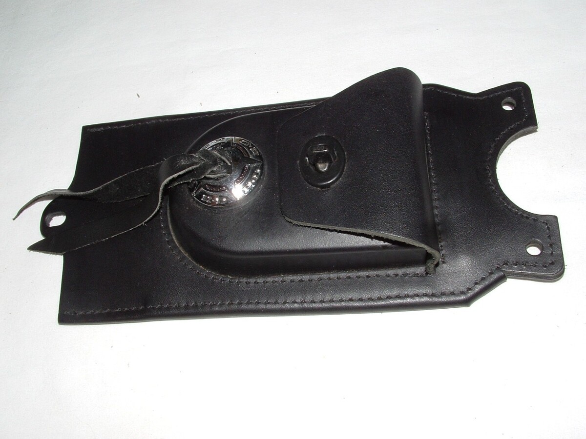 Harley Davidson Leather tank Panel with pouch and concho. Part number 91120-04. Fits 2004 and up FXDWG models. May or may not fit other models/years so check with your dealer on that. How far up in model years this fits I don't know, so again check with your dealer. This is a new part. Has the factory box, but the box is a little rough as shown. The part is perfect. The price tag shown is from 2004. $5.00 shipping to the lower 48.