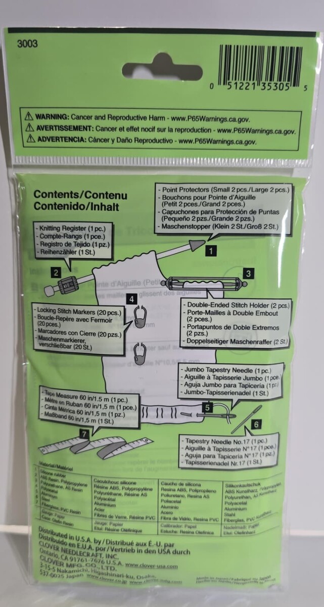 Includes a 60-inch (1.5m) fiberglass tape measure and a knitting needle gauge.