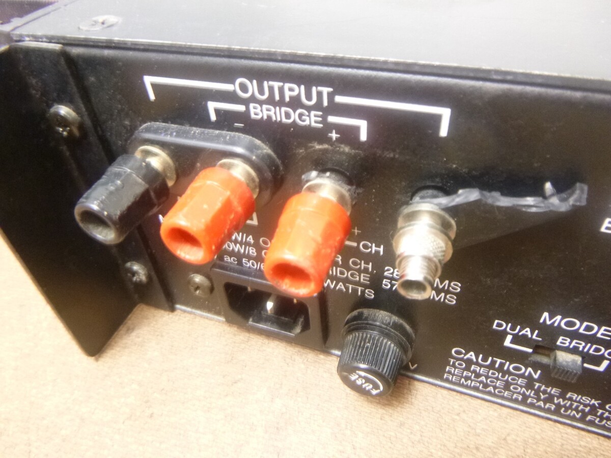 I don't know much about testing electronics, but I hooked this up to a boombox headphone jack, one channel at a time, and I only hear static coming from each channel. I was running through an old boombox, small speakers and one channel at a time. This unit has some scratches and scuffs and the plastic around the channel 1 speaker connections is broken (see pictures). I am offering this AS-IS.