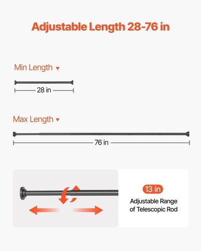 Adjustable Length: The middle part of the tension shower rod can be connected with multiple extension tubes with an adjustable length (28-76 in). The multi-section screw connection can evenly bear the weight and reduce the risk of breakage