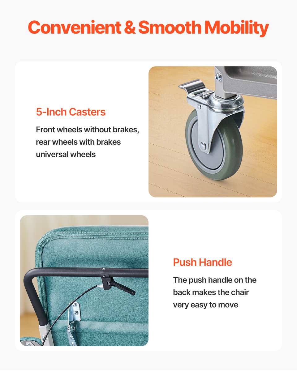 Effortless Mobility: Our medical geri recliner features four 5-inch smooth-rolling casters, including 4 universal wheels (2 lockable rear wheels with brakes), along with a convenient push handle, ensuring smooth movement and secure positioning across various spaces