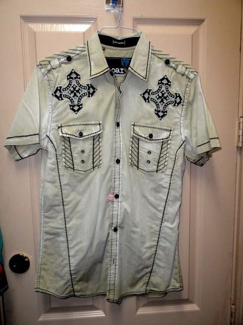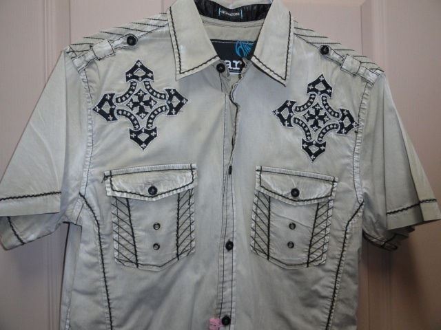 This is a preowned Roar Tan Short Sleeve Medium size Adult shirt. Has embroidered design front and back. Good condition. Hardly worn. No missing buttons or issues. Fresh Laundered. We Ship Worldwide fully insured.
