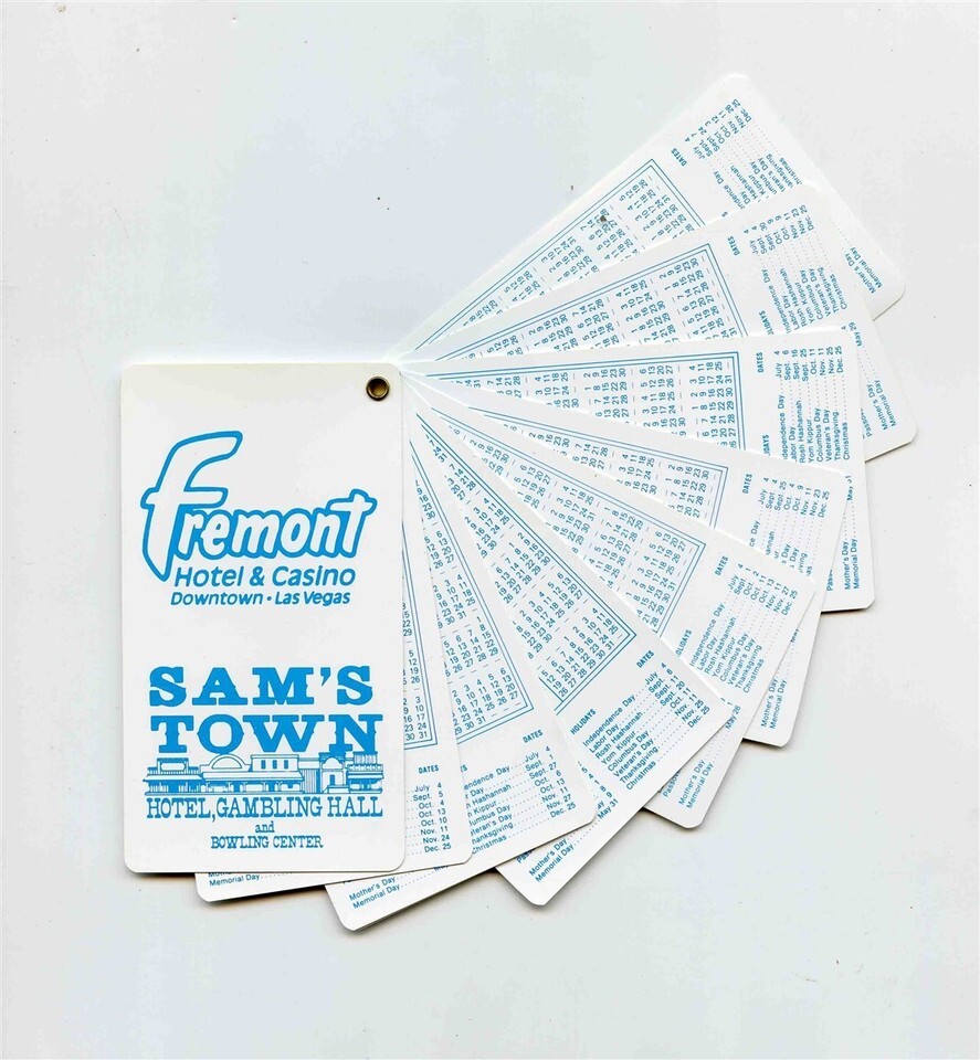 An interesting multi page plastic swivel calendar with a single page for each year from 1987 to 2005. From the Stardust Hotel , Sam's Town Gold River, Fremont Hotel, Sam's Town Hotel, and California Hotel Casino . In Las Vegas Nevada. Measures about 2" x 3 5/8" when closed.