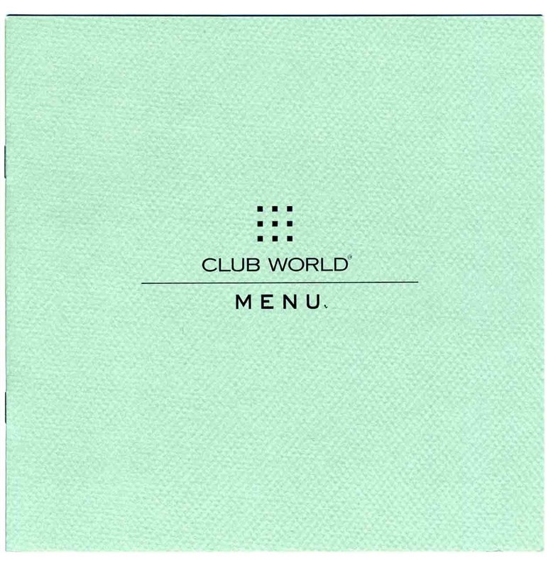 A British Airways Club World Menu from flight from Dar Es Salaam to Entebbe to London 8 pages for light refreshments, dinner and continental breakfast. The menu measures about 8 1/4" x 8 1/4" when closed. In very fine condition