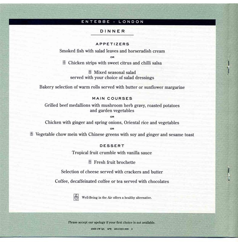 British Airways Club World Menu Dar Es Salaam to Entebbe to London