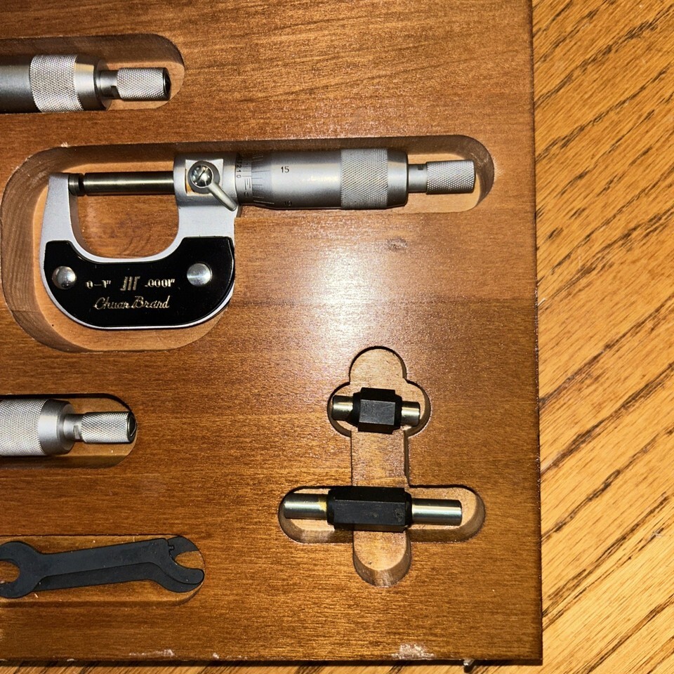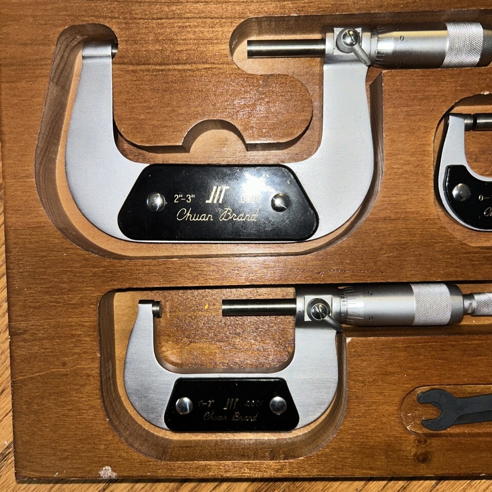 CHUAN BRAND MICROMETER SET 0-1", 1-2", 2-3" WITH WOODEN CASE. Condition is Used. Shipped with USPS Ground Advantage.