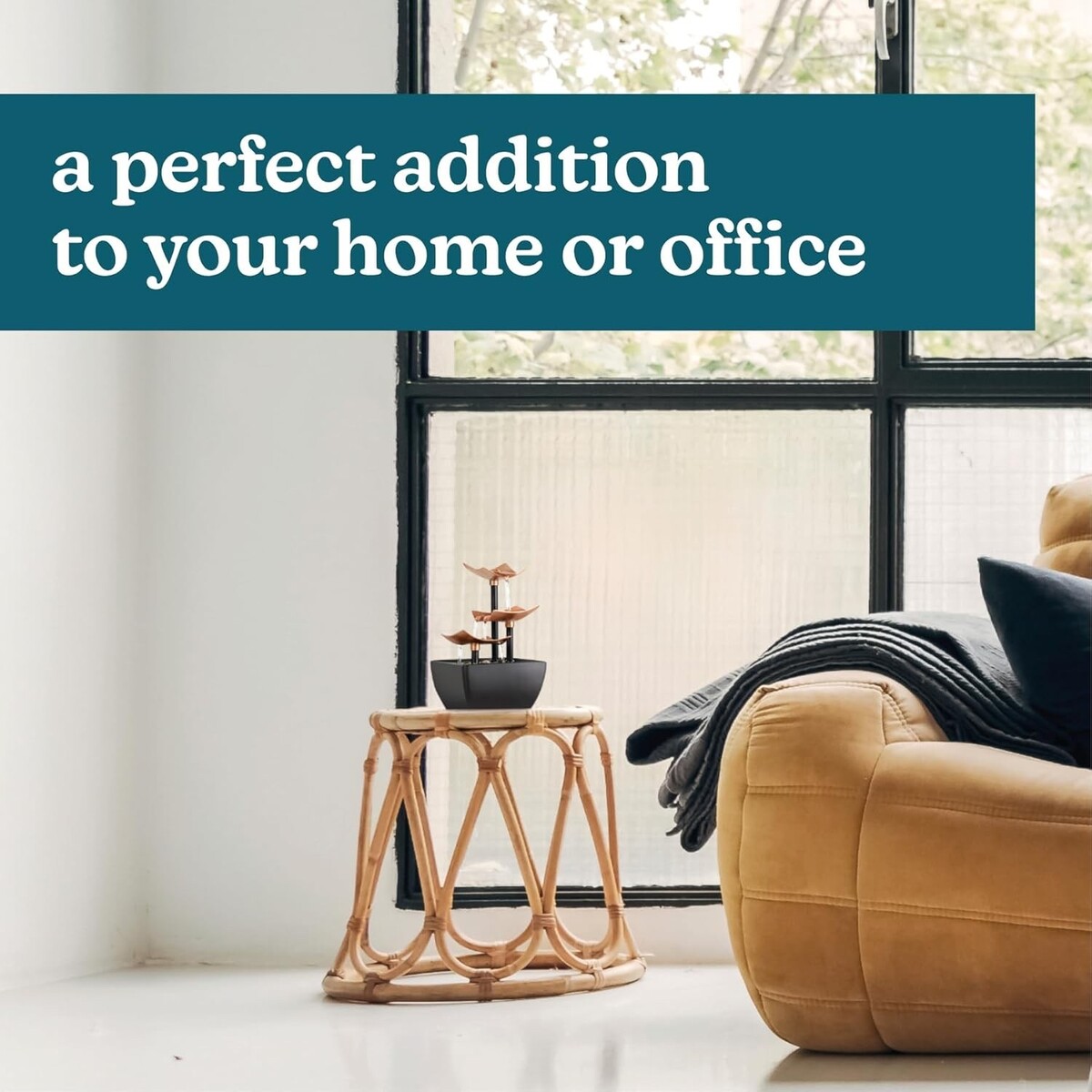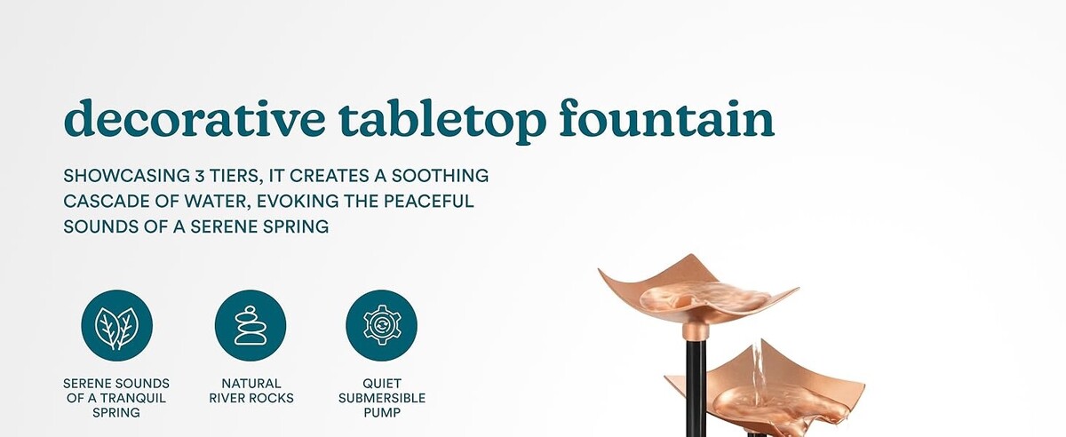 Our Serenity Fountain is an indoor tabletop water fountain. Its smaller size allows it to fit almost anywhere in your home. Compact and lightweight, the fountain features copper-colored metal tiers. Water flows from tier to tier and down into the black plastic bowl. Looks great on an end table or in an entryway. Includes an recirculation pump, pump cover, river rocks, leaf tiers, fountain base and a quick start guide. Measures 4.9"L x 4.9"W x 8.66"H. Indoor use only.