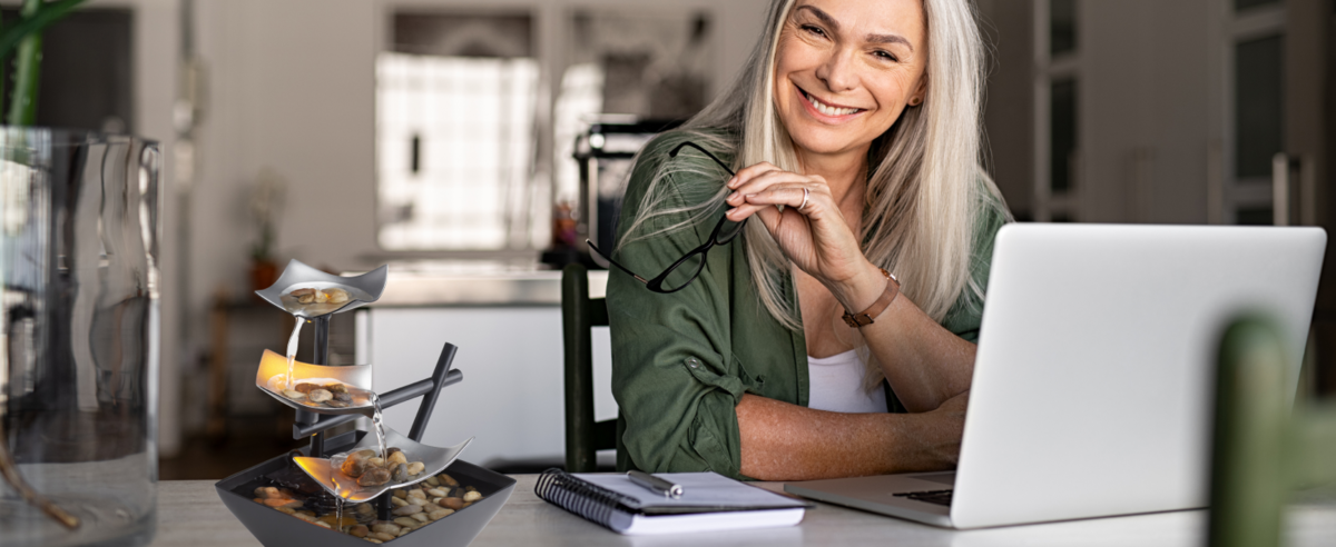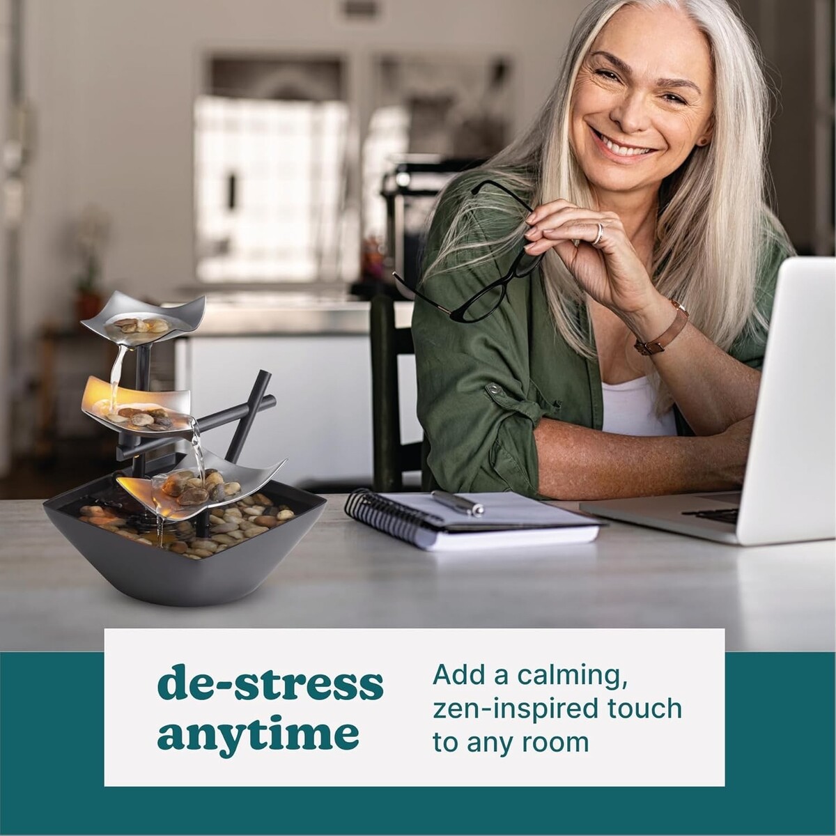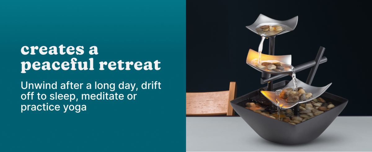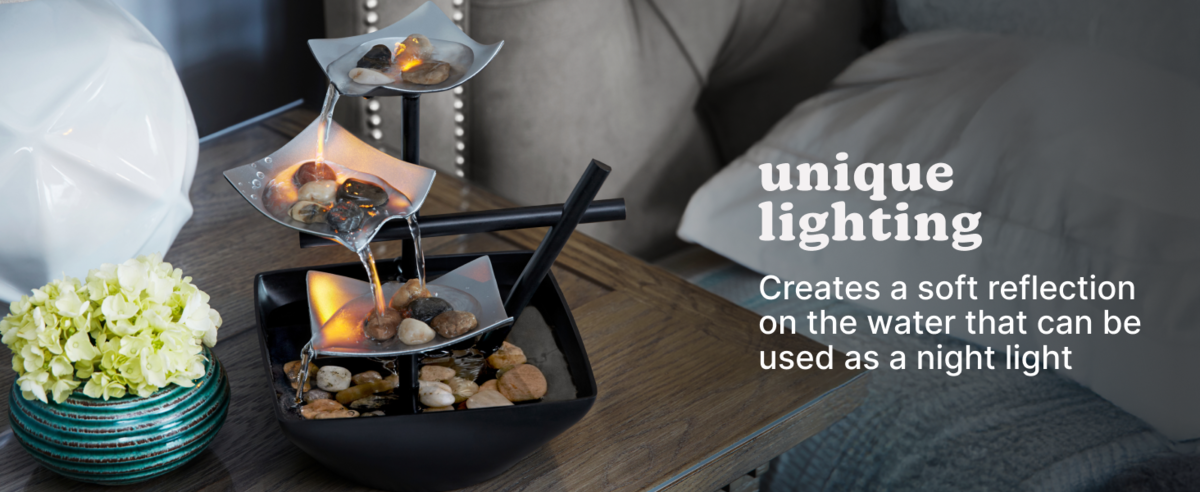 Our Serenity Fountain is an indoor tabletop water fountain. Its smaller size allows it to fit almost anywhere in your home. Compact and lightweight, the fountain features silver-colored metal tiers. Water flows from tier to tier and down into the black plastic bowl. Looks great on an end table or in an entryway. Includes an recirculation pump, pump cover, river rocks, leaf tiers, UL Listed 120v Wall Plugin, fountain base and a quick start guide. Measures 8.21"L x 7.25"W x 8.25"H. Indoor use only.