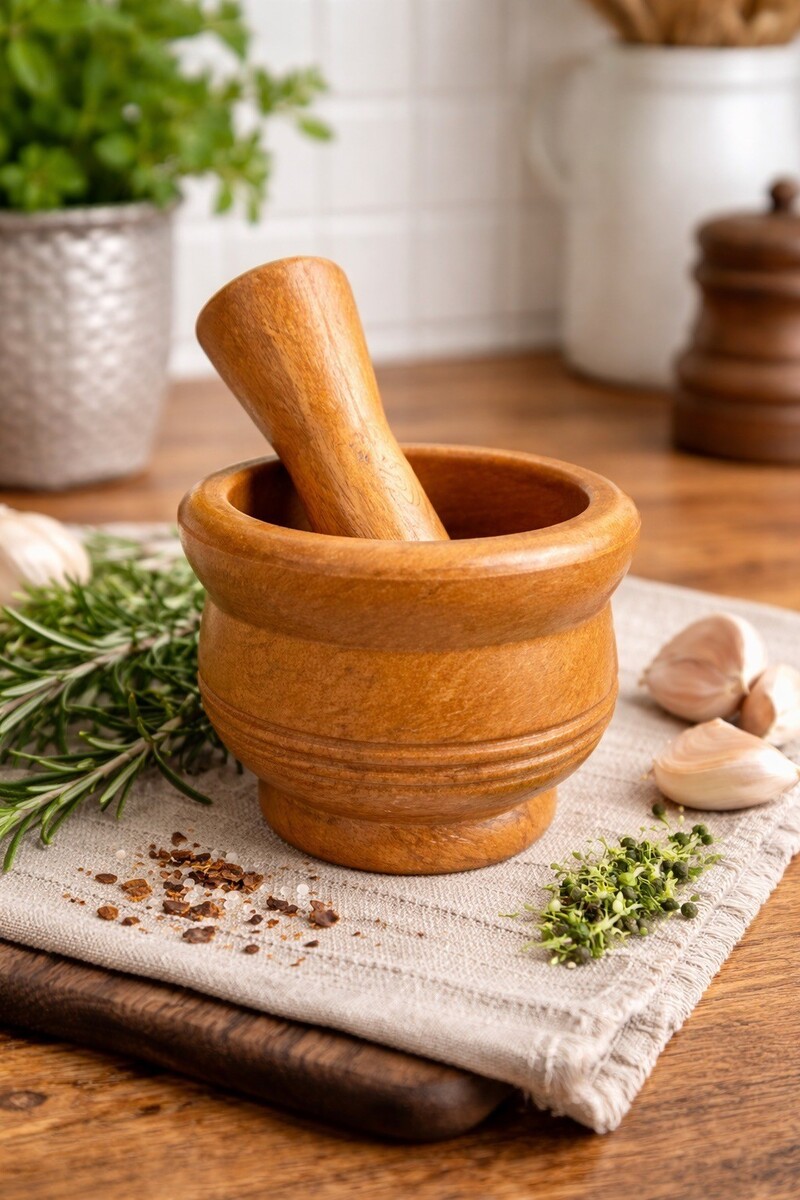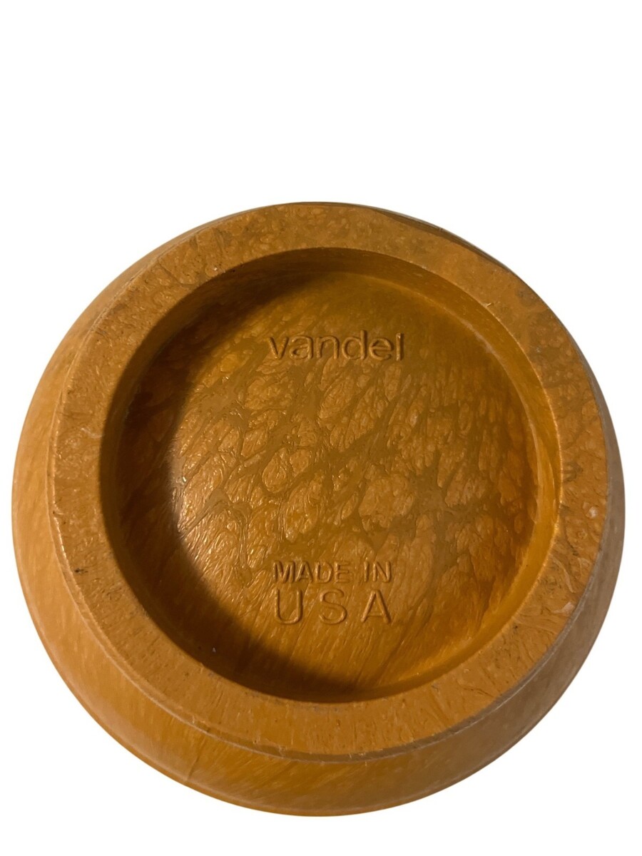 Vintage Vandel mortar and pestle made in the USA from durable phenolic resin composite designed to mimic the look of wood. This mid-century kitchen tool features a deep molded bowl and a well-balanced pestle ideal for grinding herbs, spices, seeds, or garlic. The phenolic material resists moisture and odors better than wood, making it both practical and long-lasting. Marked on the base with the Vandel name and Made in USA.