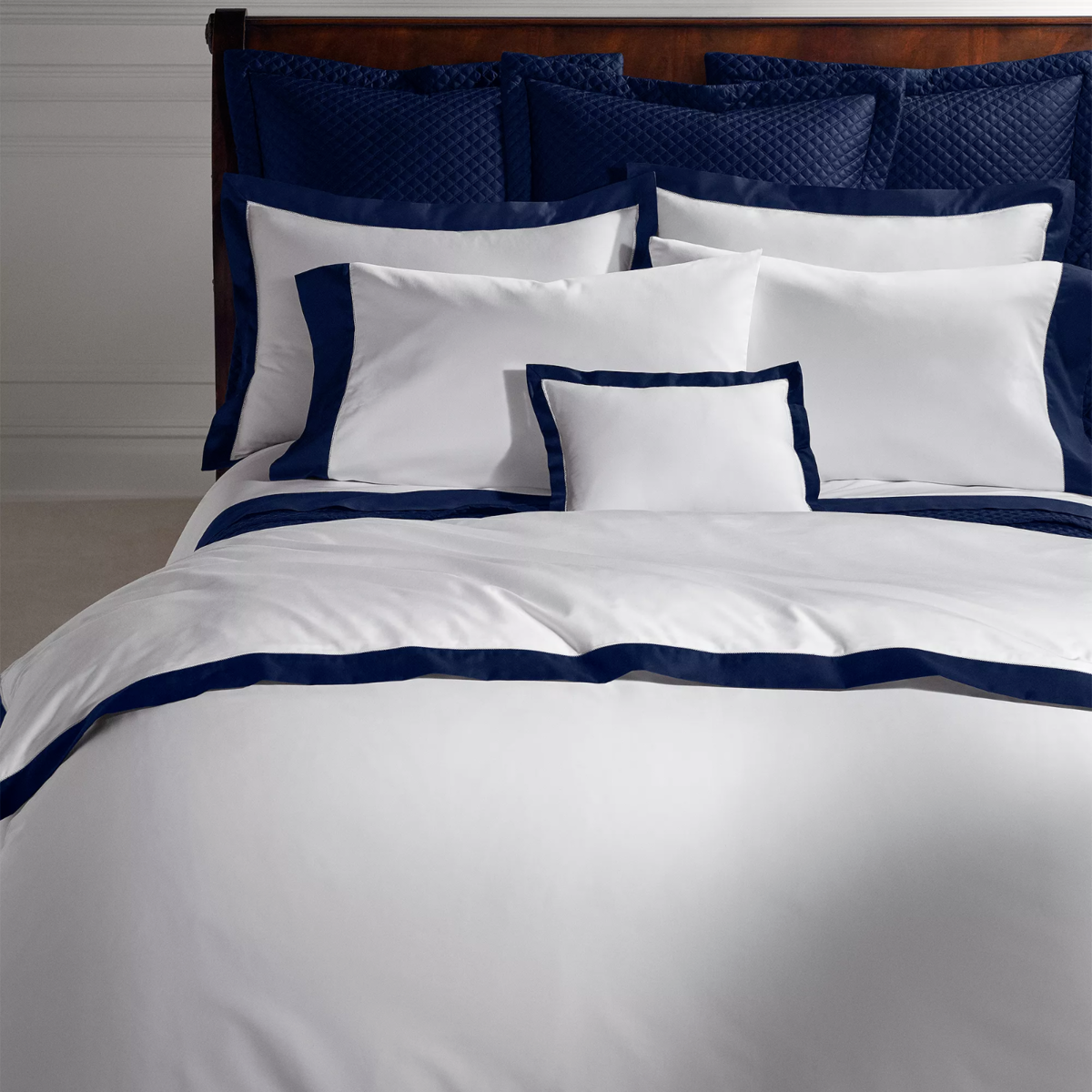 Ralph Lauren's Organic Sateen Border Bedding Collection features a silky, smooth finish with French seams and a colorful contrast flange.