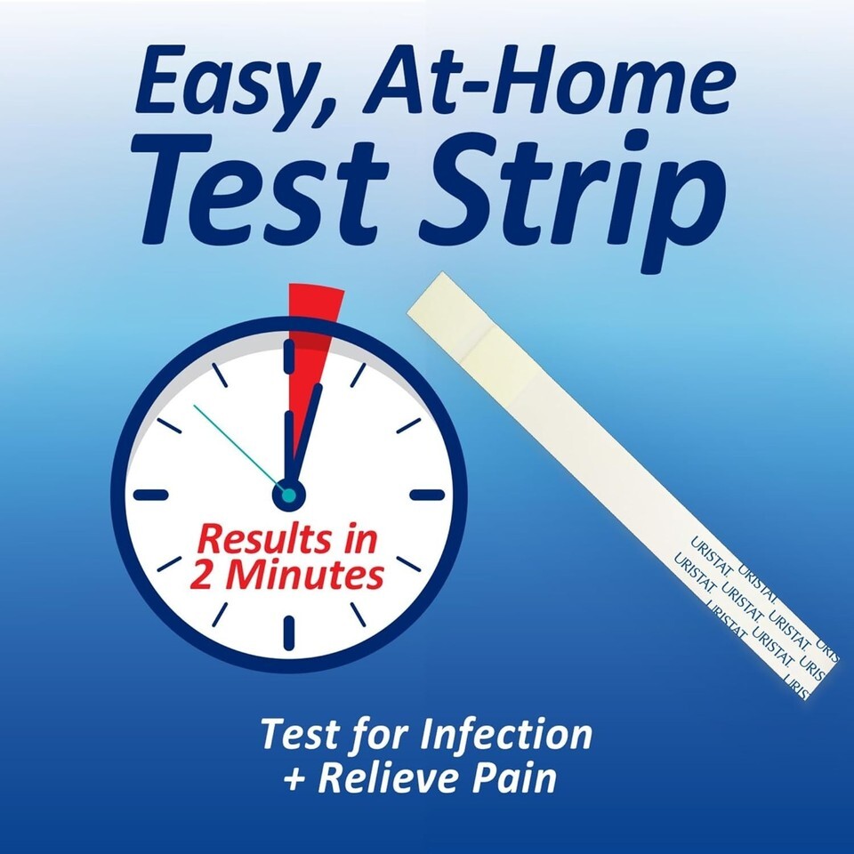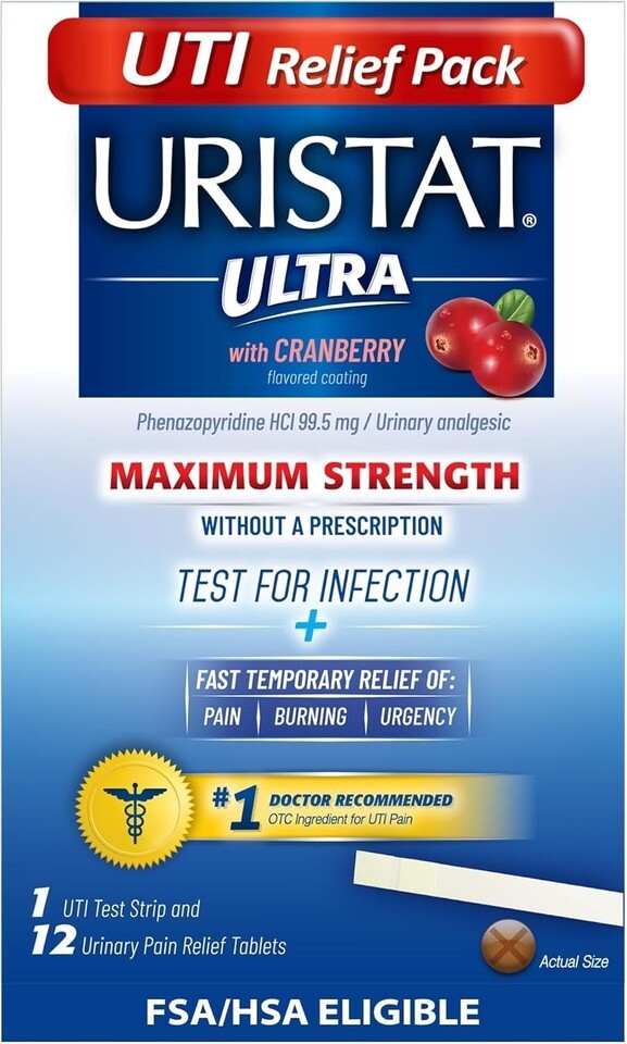 URISTAT Ultra UTI Pain Relief Pak contains 1 box of 1 UTI Test Strip and 12 cranberry-flavored tablets of UTI medicine for women and men