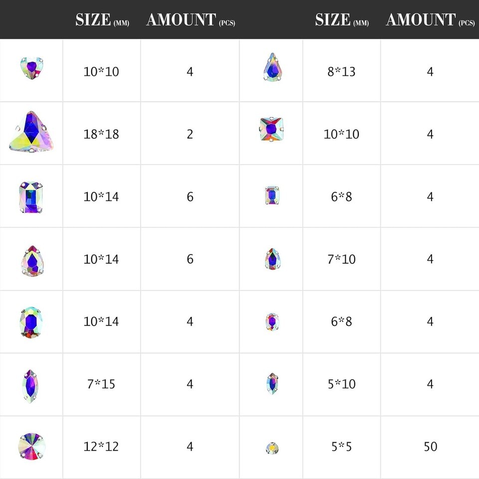 Sizes and Shapes: Each pack comes with 10 shapes of claw sew on crystals, assorted in different sizes, please refer to picture display for detail size information