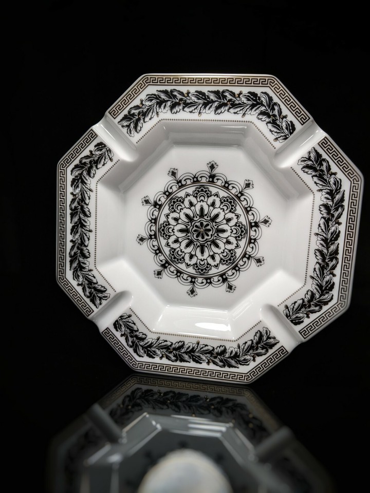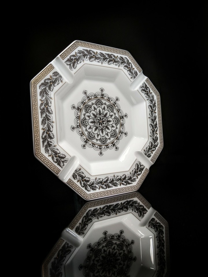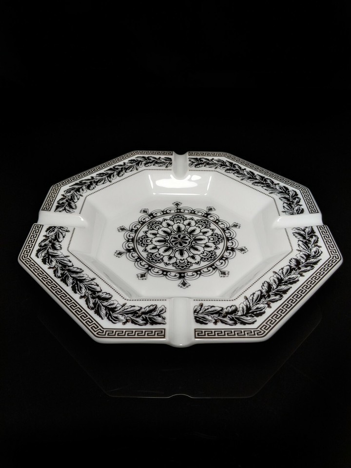 The ashtray is adorned with the Marqueterie design and features the iconic Medusa head logo. It is 1 inch in height and has a width of 9 inches as well. This decorative item is perfect for displaying on a shelf or coffee table and is sure to impress any guest.