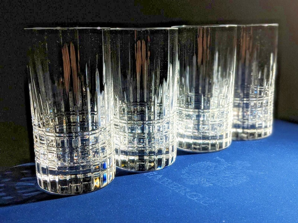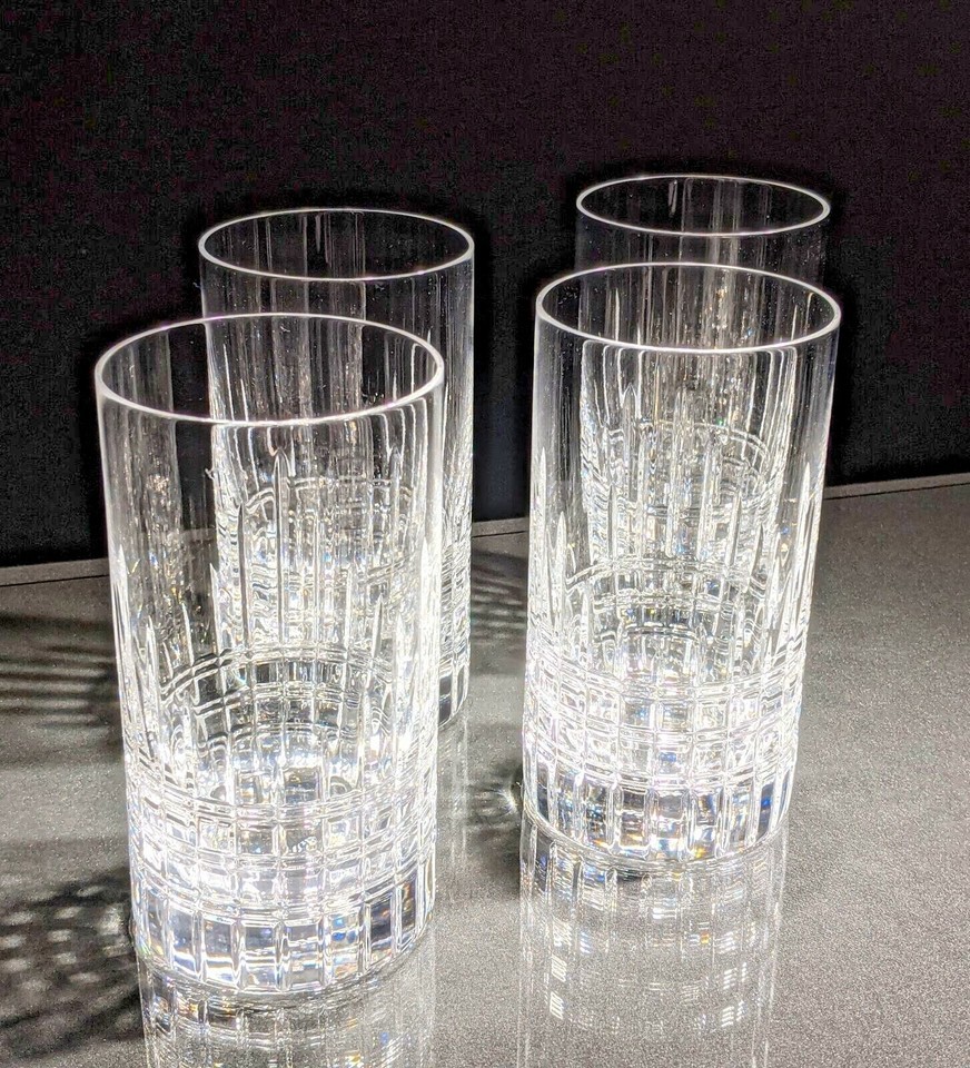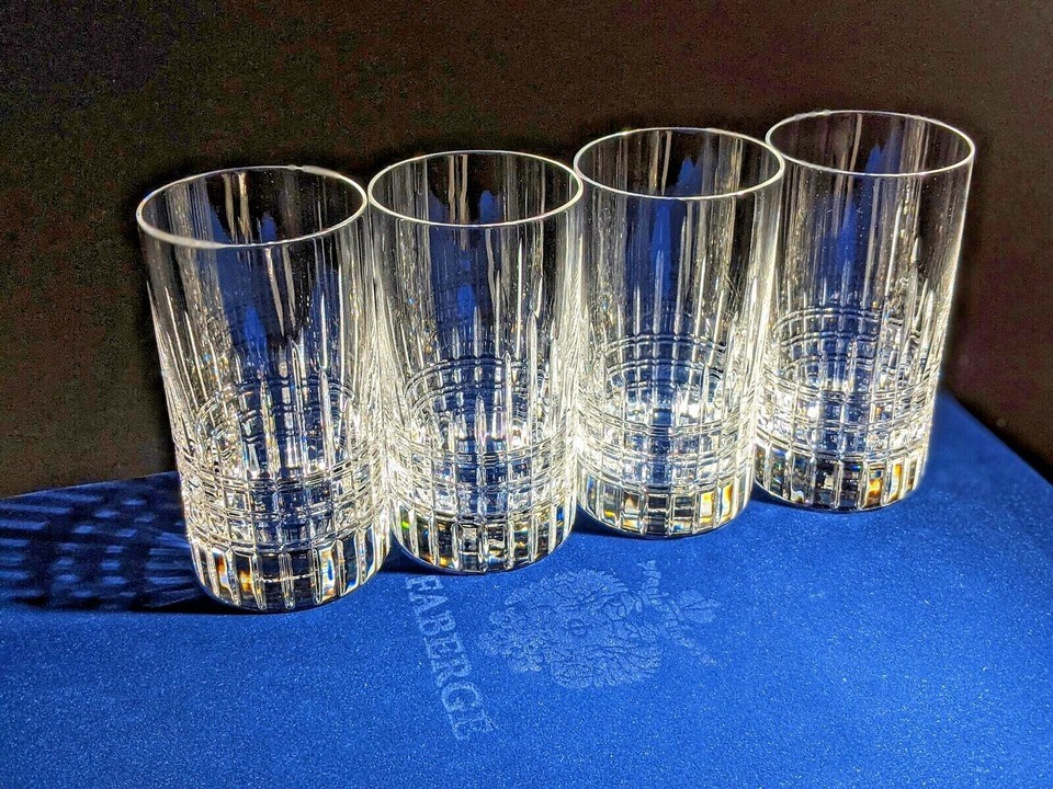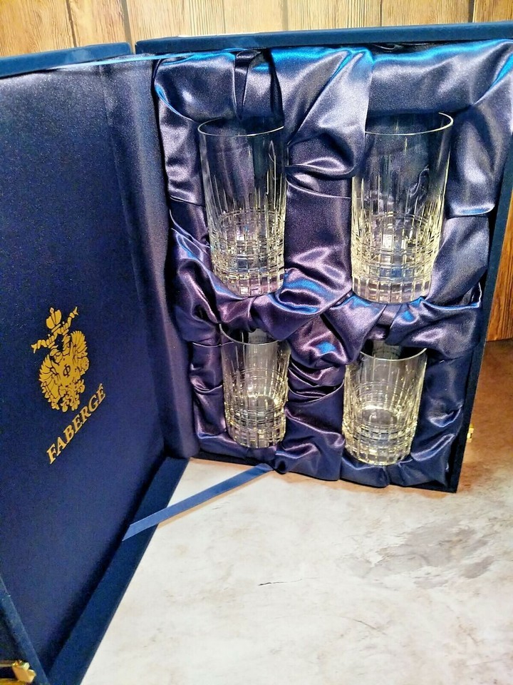 This is a new set of 4 Faberge Atelier Clear Crystal Collection Tall Glasses. Made in Slovenia. These measure 5 3/8" H x 2 3/4" W. They are all etched Faberge on the bottoms . These 4 glasses come in the original Faberge blue velvet presention case. Authenticity card included. We Ship worldwide fully insured. Signature is require upon delivery.