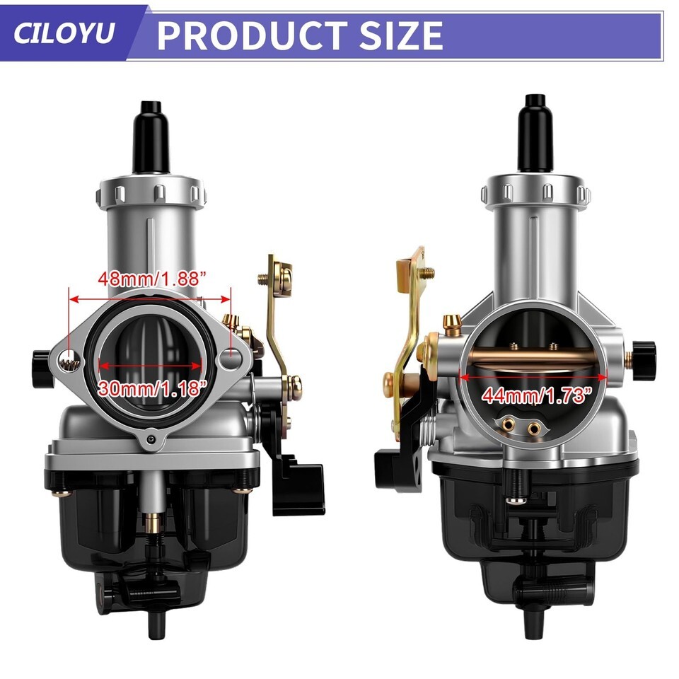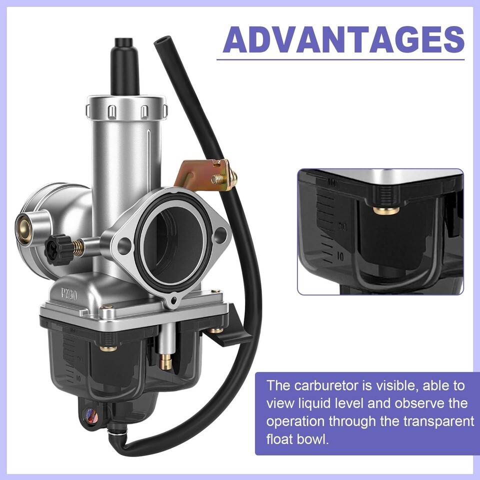 Package Includes: 1 * PZ30 carburetor, 1 * exhaust header pipe, 1 * muffler, 1 * 42mm air filter, 1 * intake manifold, 1 * 12mm air filter, 1 * fuel filter, 3 * gaskets, 1 * fuel line, 6 * clamps, 3 * wrenches, 6 * screws, 4 * ties, 1 * heat shield tape