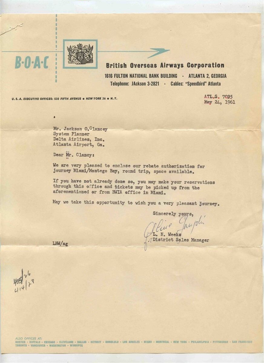 BOAC Ticket Jacket and British Overseas Airways Corporation Letter 1961