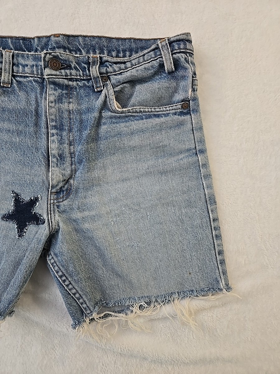 The Levi's 517 Vtg 1991 Custom Cutoff Denim Shorts Jorts Mens Sz 32 Patchwork USA are vintage denim shorts from 1991 with a star patchwork design, featuring a button closure and a mid-rise fit. Made of cotton denim, these men's shorts have a 5-inch inseam and a 32-inch waist size, making them perfect for casual or travel occasions during the summer, fall, or spring seasons. With a USA-themed design and a traditional 5-pocket design, these Levi's shorts offer a unique and nostalgic style for those who appreciate 80s and 90s fashion.