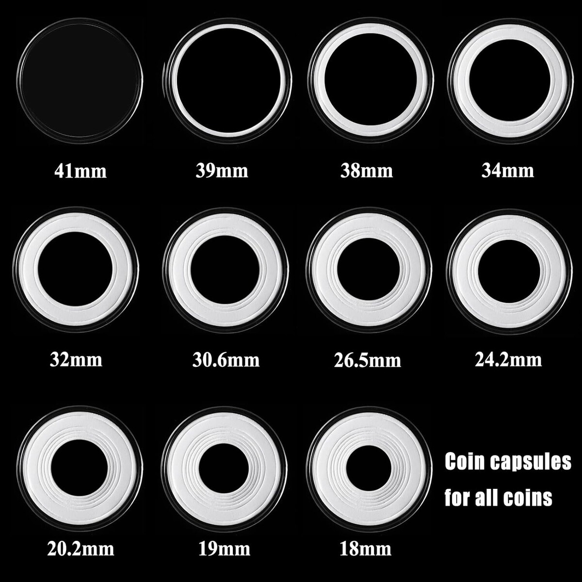 Coin Collecting Supplies Size: coin capsules Inside Diameter 41mm, Outside Diameter 46mm .Made of high transparent premium plastic ,dust-proof and anti-oxidation, NO PVC.