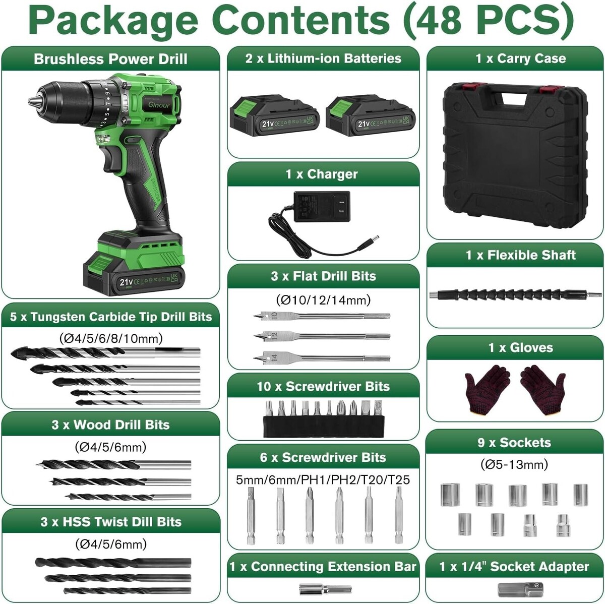 Set Includes: Battery Charger,2 x 1.5Ah lithium batteries,charger,16 screwdriver bits,connecting extension bar,9 sockets,1/4" socket adapter,3 wood drill bits,2 flat wood drill bits,3 HSS twist drill bits,flexible shaft,gloves,instruction manual,carry box